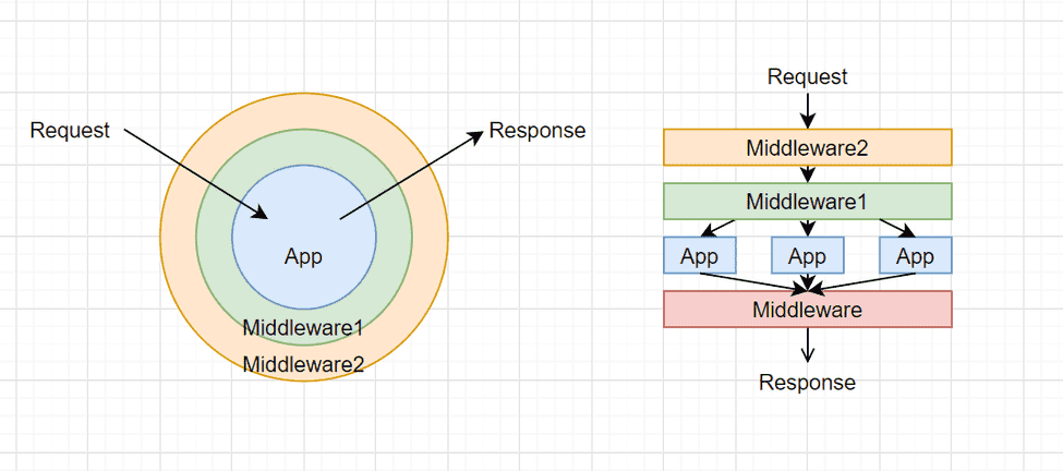 比较常见的中间件模型有两种,一种是洋葱模型,一种是切面模型,其实这两个可以看成是一种,不过分开来比较好理解 2333。
